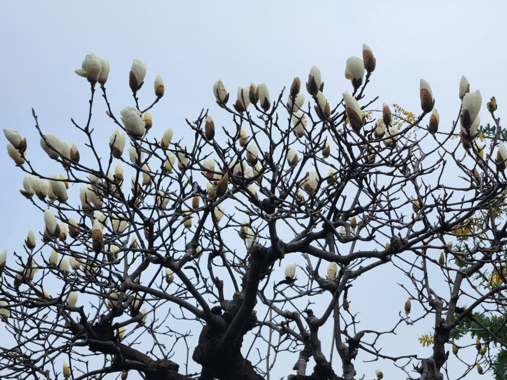 この数年毎年写真を撮っているあのハクモクレンです。私の一番好きな春の花。これを見ると一層春の訪れを感じます。